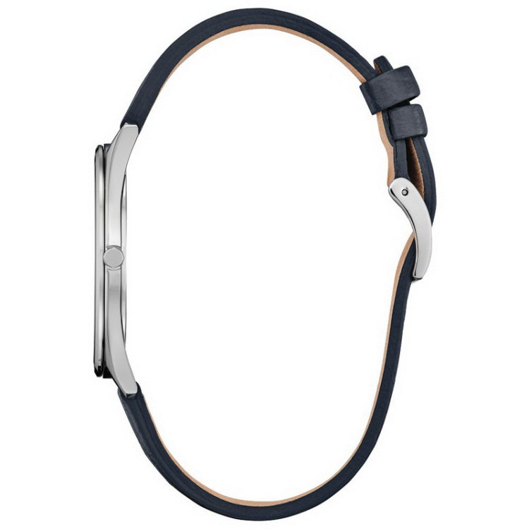 Classic lines and a simple silhouette define the newest addition to the Classic collection. This all-purpose dress watch features a versatile silver-tone stainless steel 38.4mm case, a two-hand blue dial featuring an entrancing metallic powder aesthetic with silver-tone hands and markers, and is secured to the wrist via a grained blue leather strap with buckle closure. Sustainably powered by any light with Eco-Drive technology and never needs a battery. Water resistant to 50 meters. Caliber G872.