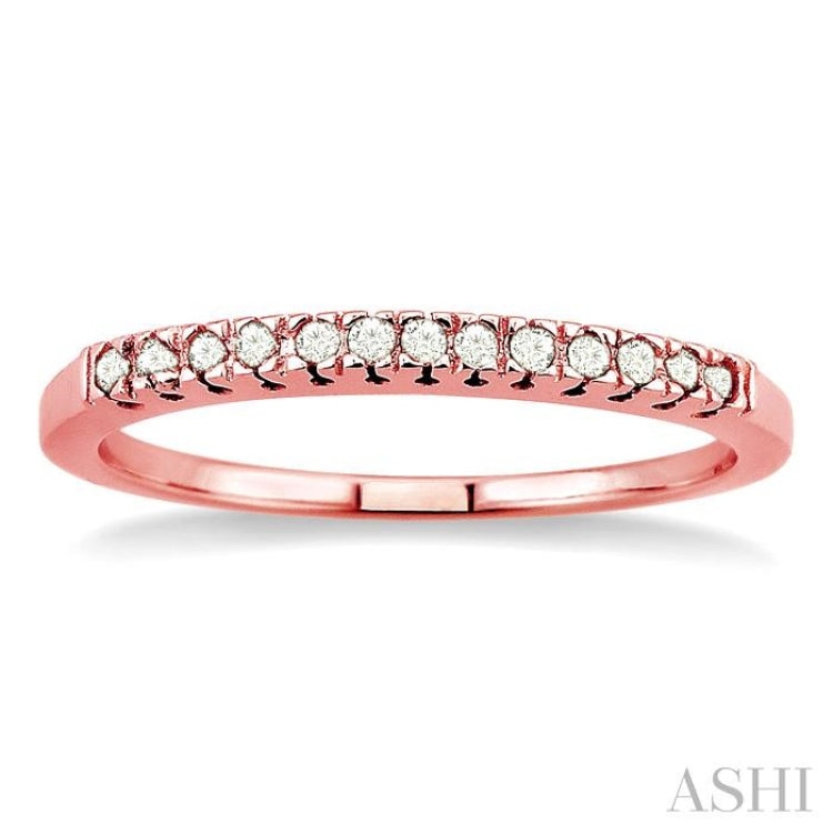Allure your loved ones with this articulate diamond band fashioned in luminous 14 karat rose gold. This beautiful design showcases 13 sparkling round cut diamonds calmly rests in pave set and elegantly accumulates on the band. The total diamond weight is 1/10 Ctw.