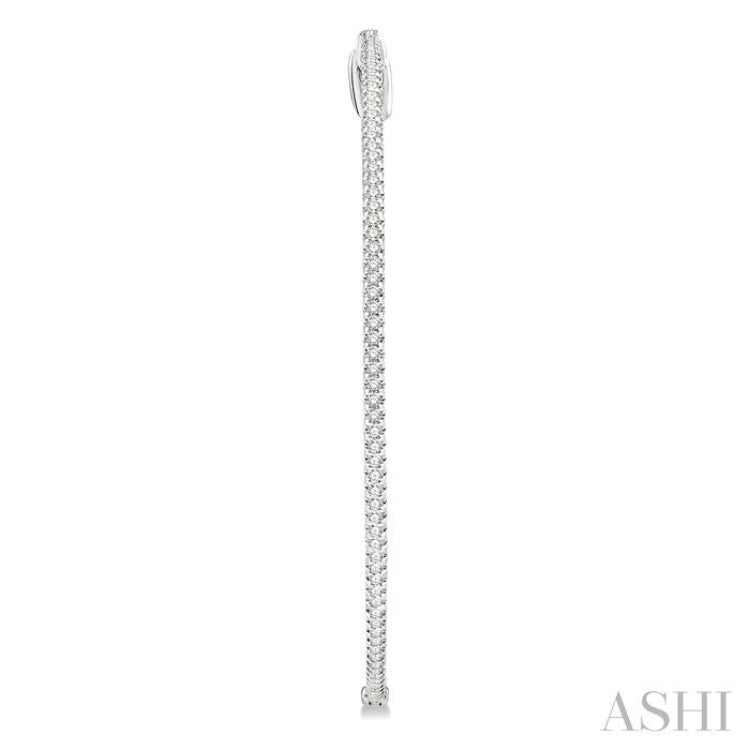Sleek and gorgeous, these diamond hoop earrings are a must have. They are lavish and offer an enchanting look with a breathtaking layout of round cut diamonds on the outside, as well as on the inside of the earrings, along the inner back. There is a total of 212 prong set round cut diamonds adorning the hoops, 106 diamonds on each hoop. The diamond hoop earrings are styled in a polished rhodium finish 14 karat white gold. Total diamond weight is 1 Ctw.
