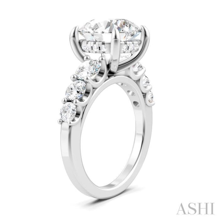 Create a personalized symbol of love, with this alluring semi-mount diamond engagement ring that exudes timeless beauty. The ring showcases a prong-raised round-shaped center mount, awaiting a center stone of your choice. A round cut diamond ranging between 3.65 Ctw to 4.50 Ctw is the apt choice for it. Besides the center stone, the ring comes pre-adorned with 3 each prong set round cut diamonds of varying carat weights on either side of the shank. These include 2 each of 1/3 Ctw, 1/6 Ctw, and 1/10 Ctw round cut diamonds. Adding subtle brilliance are 16 microscopic split prong set round cut diamonds in the gallery region. The semi-mount engagement ring is styled in a rhodium finish 14 karat white gold. The total diamond weight is 1 1/5 Ctw.
